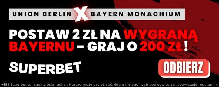 - Zagraj za min. 2 zł pierwszy zakład pojedynczy na zwycięstwo Bayernu Monachium w meczu z Unionem