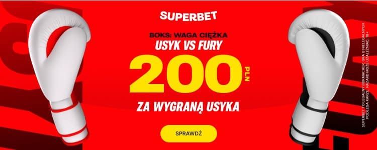 Superbet przygotował specjalną ofertę na sobotnią walkę. Oferuje bowiem możliwość zagrania zakładu na wygraną Ołeksandra Usyka po kursie 100. Z oferty można skorzystać podając podczas rejestracji kod promocyjny GOAL. Poniżej wyjaśniamy krok po kroku co trzeba zrobić, aby skorzystać z promocji.