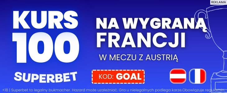 W tym miejscu zachęcam do skorzystania z promocji u bukmachera Superbet. Podczas rejestracji podając nasz kod promocyjny GOAL będziesz mógł skorzystać z promocji i postawić wygraną reprezentacji Francji z kursem 100.00. Więcej informacji o tej ofercie znajdziesz wyżej w tym artykule.