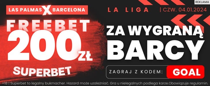 FC Barcelona jest murowanym faworytem do zwycięstwa, to oczywiście nie podlega dyskusji. Przekonani o takim rozstrzygnięciu są również bukmacherzy. Kursy na wygraną Dumy Katalonii są minimalne. Warto jednak zwrócić w tym miejscu uwagę na ofertę Superbet. Jeżeli podczas rejestracji podasz w Superbet kod promocyjny GOAL otrzymasz możliwość otrzymania freebetu o wartości 200 zł za poprawne wytypowanie przynajmniej dwubramkowego zwycięstwa Barcelony. Więcej informacji o tej ofercie znajdziesz nieco wyżej.