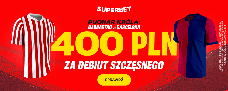 Trudno spodziewać się w tym pojedynku innego rozstrzygnięcia niż wygrana Barcelony i jej awans do dalszej fazy rozgrywek. Kursy na takie zdarzenie są jednak atrakcyjne. Rozważając typ na tem mecz rozważyłbym postawienie zakładu na wygraną Dumy Katalonii większą różnicą bramek. Warto również zwrócić uwagę na jedną z ofert bukmacherów. Superbet nowym klientom oferuje bonus 400 zł, jeżeli w meczu wystąpi Wojciech Szczęsny. Więcej informacji znajdziesz poniżej.