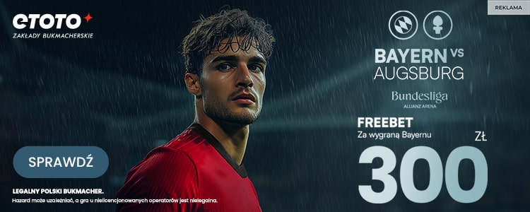 Niezwykle atrakcyjną ofertę na piątkowe spotkanie przygotował bukmacher ETOTO. Oferuje bowiem możliwość postawienia zakładu na wygraną Bayernu po kursie 300! Dzięki temu stawiając tylko 1 zł można zgarnąć freebet o wartości 300 zł. Poniżej krok po kroku wyjaśniamy warunki, jakie trzeba spełnić, aby skorzystać z oferty.