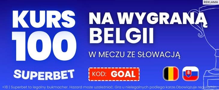 Wyżej znajdziesz również informacje o świetnej promocji Superbet, który pozwala nowym klientom postawić zakład na wygraną Belgii po kursie 100.00. Aby skorzystać z oferty należy zarejestrować konto w Superbet z kodem promocyjnym GOAL.