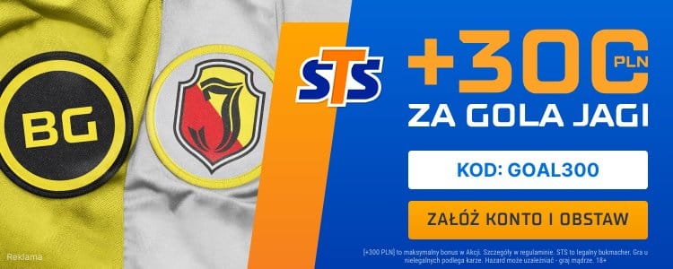 Warto również zwrócić uwagę na ofertę STS. Bukmacher oferuje bowiem bonus 300 zł za wytypowanie gola dla Jagiellonii w tym pojedynku. Do skorzystania z oferty upoważnia STS kod promocyjny GOAL300. Więcej informacji o ofercie znajdziesz wyżej.
