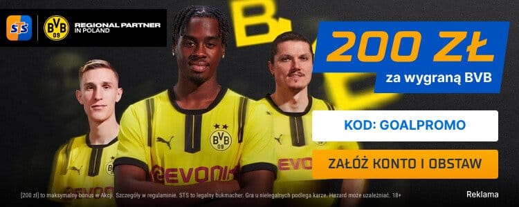 Według bukmacherów, faworytem sobotniej potyczki jest Borussia Dortmund. Jeśli rozważasz typ na wygraną gospodarzy, to kursy na takie zdarzenie oscylują w granicach 2.15 – 2.22. W przypadku zwycięstwa RB Lipsk natomiast sięgają nawet 3.00. Przy okazji tego meczu warto zapoznać się z ofertą bukmachera STS. Kod promocyjny do STS to GOAL. Gwarantuje on najwyższy bonus powitalny na rynku oraz zakład bez ryzyka do 100 zł.