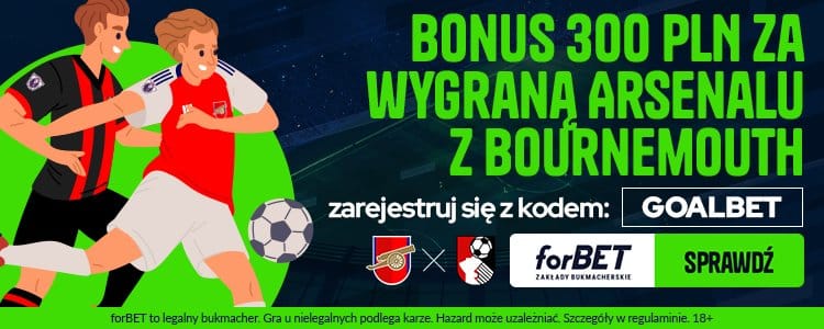 Świetną promocję na sobotnie spotkanie przygotował bukmacher forBET. Oferuje bowiem możliwość postawienia zakładu na wygraną Arsenalu po kursie 300! Warunkiem skorzystania z oferty jest rejestracja konta w forBET z kodem promocyjnym GOALBET. Poniżej wyjaśniamy krok po kroku co trzeba zrobić.