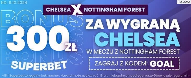 Ciekawą i atrakcyjną promocję na niedzielny mecz przygotował bukmacher Superbet. Zakładając konto z kodem promocyjnym GOAL będziesz mógł postawić zakład na wygraną Chelsea po kursie 150 i zgarnąć dzięki temu bonus o wartości aż 300 zł. Poniżej wyjaśniamy jakie warunki należy spełnić.