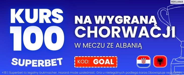 Po porażce z Hiszpanią, reprezentacji Chorwacji nie może sobie pozwolić na potknięcie z Albanią. W promocji Superbet zakład na wygraną Chorwacji możesz postawić po bardzo wysokim kursie 100 (przy stawce 2 zł). Stawiając taki kupon masz szansę zgarnę bonus 200 zł. Z oferty skorzystasz rejestrując konto z kodem GOAL. Poniżej instrukcja krok po kroku.