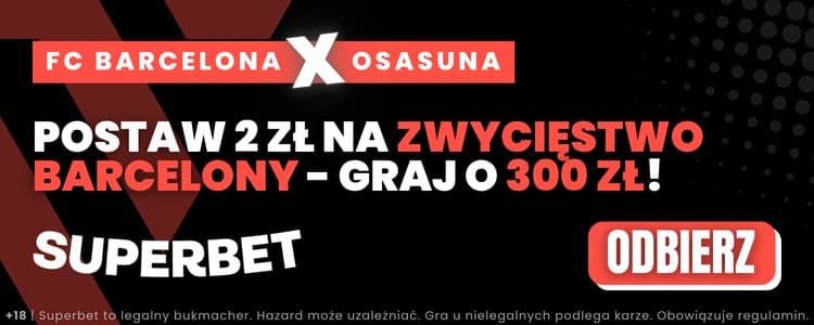 - Zagraj za min. 2 zł pierwszy zakład pojedynczy na zwycięstwo Barcelony w meczu z Osasuna