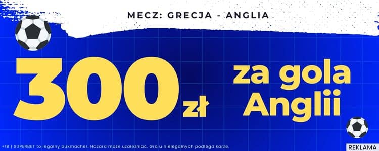 Bardzo atrakcyjną ofertę na czwartkowy mecz przygotował Superbet. Oferuje aż 300 zł bonusu za zakład na choćby jednego gola Anglii. Taki bonus uzyskasz stawiając kupon już za zaledwie 2 zł, co oznacza w praktyce kurs 150. Z oferty możesz skorzystać zakładając konto z kodem GOAL. Poniżej wyjaśniamy co trzeba zrobić.