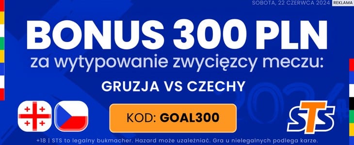Przy okazji tego meczu można skorzystać z oferty STS i stawiając tylko 2 zł odebrać bonus wysokości 300 zł za wygrany zakład na zwycięstwo Gruzji lub Czech. Z promocji można skorzystać podając kod promocyjny GOAL300 podczas rejestracji konta w STS. Niżej znajdziesz instrukcję jak skorzystać z oferty.