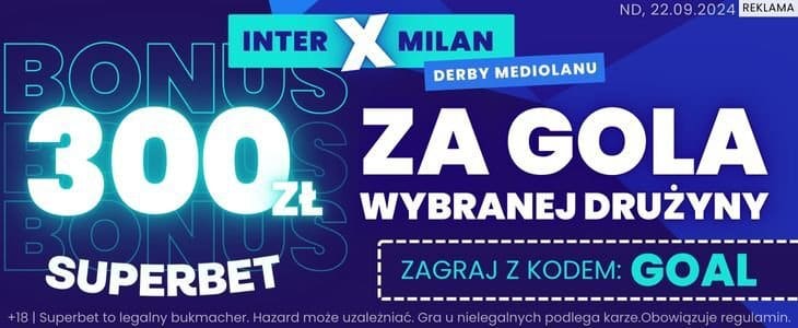 Przy okazji meczu Inter – Milan zachęcam do skorzystania z oferty u bukmachera Superbet. Zakładając konto z kodem promocyjnym GOAL możesz skorzystać z najlepszego na rynku pakietu powitalnego.