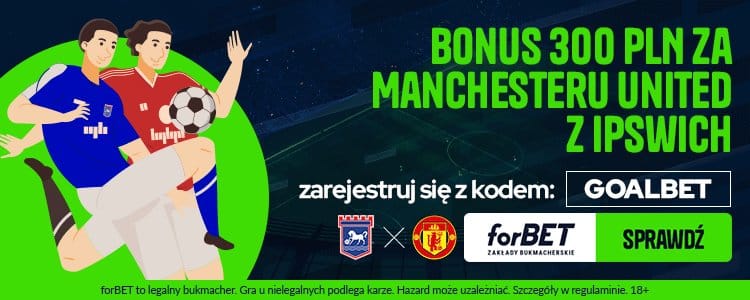 Świetną promocję na niedzielne spotkanie przygotował bukmacher forBET, który oferuje kurs 300.00 na wygraną Manchesteru United. Aby zgarnąć bonus w wysokości 300 zł, wystarczy postawić zakład za 1 zł. Do skorzystania z oferty uprawnia kod promocyjny GOALBET. Poniżej krok po kroku prezentujemy zasady: