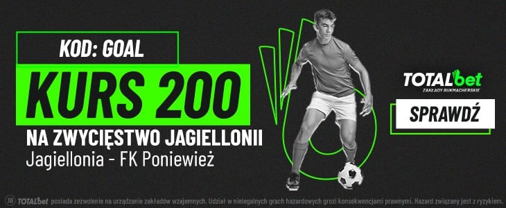 Totalbet przygotował na rewanżowy mecz specjalną promocję, dzięki której można postawić zakład na wygraną Jagiellonii po bardzo wysokim kursie 200! Do skorzystania z oferty uprawnia rejestracja konta w Totalbet z kodem promocyjnym GOAL. Poniżej wyjaśniamy krok po kroku co trzeba zrobić.