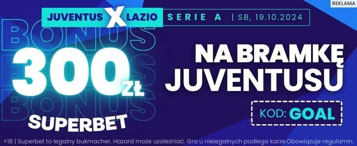 Jeżeli nie posiadasz jeszcze konta w Superbet, możesz skorzystać ze specjalnej promocji na mecz Juventusu z Lazio. Zakładając konto z kodem promocyjnym GOAL będziesz mógł postawić zakład na gola Starej Damy po kursie 150 i zgarnąć 300 zł. Poniżej wyjaśniamy co trzeba zrobić.