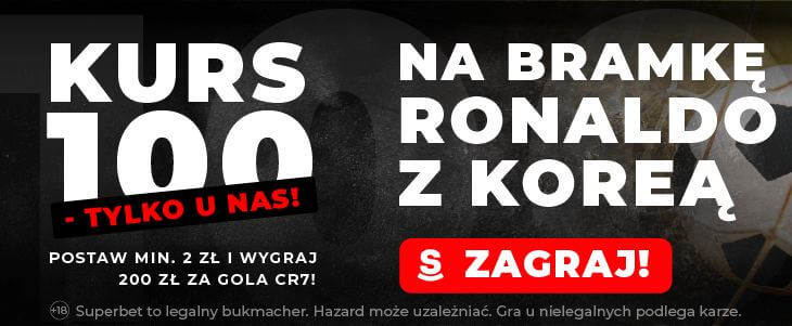 Przy okazji tego spotkania warto również rozważyć skorzystanie z promocji Superbet, który pozwala na zagranie na bramkę Ronaldo po kursie 100.00. Promocja jest dostępna tylko dla osób rejestrujących konto z kodem promocyjnym GOAL.