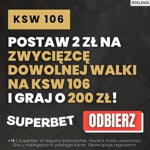 - Zagraj pierwszy zakład pojedynczy za 2 zł obejmujący typ na zwycięzcę dowolnej walki podczas KSW 106