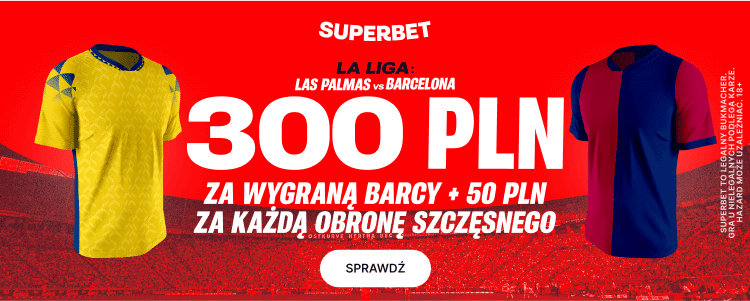 Sobotnie spotkanie będzie również dobrą okazją dla Roberta Lewandowskiego na poprawienie swojego bramkowego dorobku oraz dla Wojciecha Szczęsnego na kolejne czyste konto. Dlatego rozważając typ na ten mecz warto zwrócić uwagę na ofertę Superbet, który nowy klientom daje możliwość zagrania zakładu na wygraną Barcelony po kursie 150 oraz dodatkowo oferuje bonus 50 zł za każdy obroniony strzał przez Szczęsnego. Więcej informacji o tej ofercie znajdziesz poniżej.