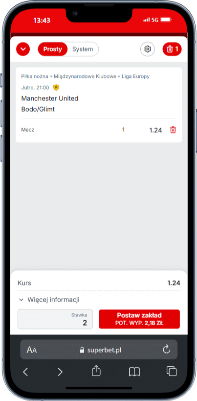 - Postaw pierwszy po założeniu konta zakład na wygraną Man Utd z Bodo/Glimt za 2 zł – jak na screenie