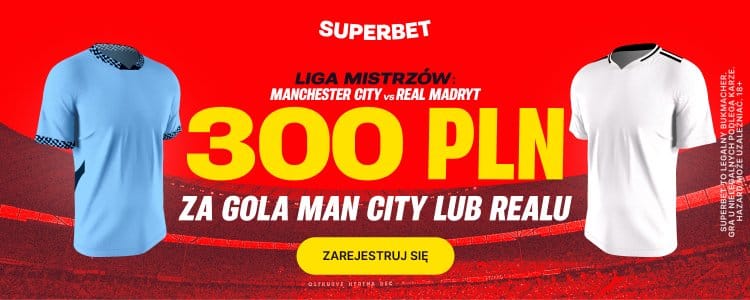 Superbet przygotował specjalną ofertę na wtorkowy hit. Rejestrując konto z kodem promocyjnym GOAL otrzymasz możliwość postawienia zakładu na choćby jednego gola Manchesteru City lub Realu Madryt po kursie 150. Stawiając taki zakład za 2 zł można zgarnąć aż 300 zł bonusu. Co trzeba zrobić?