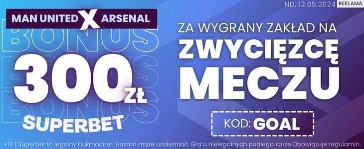 Dedykowaną promocję pod niedzielne spotkanie przygotował Superbet. Zakładając konto z kodem promocyjnym GOAL będziesz mógł odebrać bonus 300 zł za wytypowanie wygranej Manchesteru United lub Arsenalu. Poniżej instrukcja jak skorzystać z promocji.