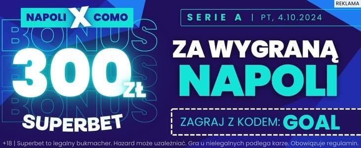 Napoli przystąpi do piątkowego meczu w roli wyraźnego faworyta. To dobra okazja do skorzystania ze specjalnej oferty Superbet, który oferuje bonus 300 zł za wytypowanie wygranej klubu z Neapolu. Co trzeba zrobić? Poniżej wyjaśniamy krok po kroku.