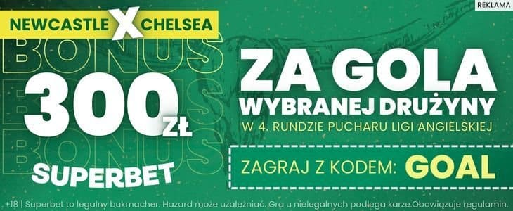 Mecz Newcastle – Chelsea to jeden z hitów 4. rundy Carabao Cup. Przy okazji tego meczu możesz skorzystać z bardzo atrakcyjnej oferty i postawić zakład na gola jednej z drużyn w podstawowym czasie gry po kursie 150. Zakład postawiony za zaledwie 2 zł umożliwia odebranie bonusu w wysokości 300 zł. Co trzeba zrobić, aby skorzystać z promocji?