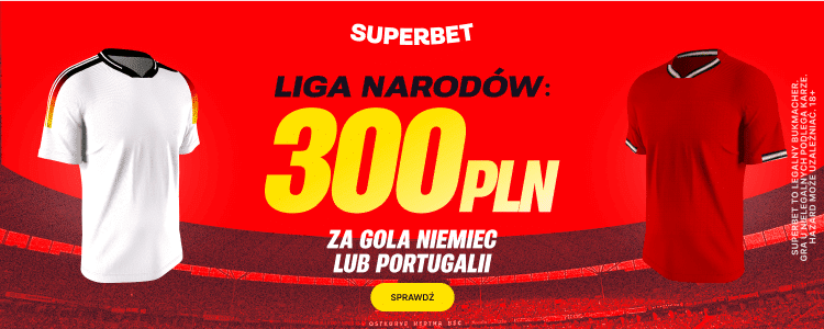 Superbet przygotował na środowy mecz Ligi Narodów specjalną ofertę i daje możliwość zagrania zakładu na wybranej drużyny w meczu Niemcy – Portugalia po kursie 150.00. Trafiając zgarniemy dzięki temu bonus o wartości 300 zł. Poniżej wyjaśniamy krok po kroku co trzeba zrobić.