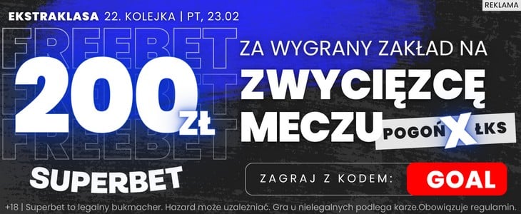 Superbet specjalnie dla Czytelników goal.pl przygotował atrakcyjną promocję na piątkowe spotkanie. Rejestrując konto z kodem promocyjnym GOAL otrzymasz możliwość postawienia zakładu na wygraną Pogoni lub ŁKS-u kursie 100.00. Stawiając tylko 2 zł możesz uzyskać bonus o wartości aż 200 zł. Jak skorzystać z tej oferty?