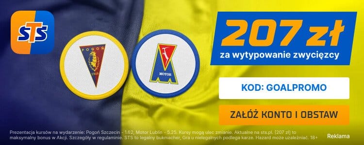 Największy polski bukmacher STS oferuje 207 zł bonusu za wytypowanie zwycięzcy meczu Pogoń – Motor. Oferta jest skierowana do osób, które zarejestrują konto z kodem promocyjnym GOALPROMO. Poniżej krok po kroku przedstawiam jakie warunki należy spełnić, aby odebrać bonus.