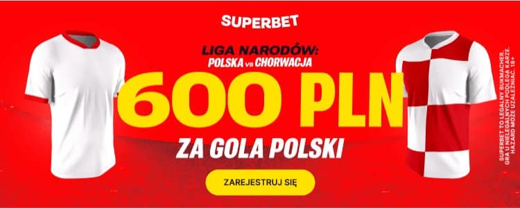 600 zł za zdobytą przez Polskę bramkę we wtorkowym spotkaniu z Chorwacją? Taki bonus możesz otrzymać korzystając z promocji przygotowanej przez Superbet dla osób, które zarejestrują konto z kodem promocyjnym GOAL. Oferta ta oznacza, że zakład na gola Polski można de facto postawić po bardzo wysokim kursie 300. Jakie warunki trzeba spełnić? Wyjaśniamy krok po kroku.