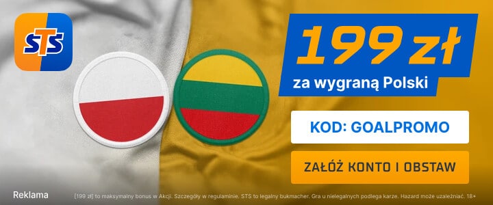 Nie ulega wątpliwości, że reprezentacja Polski będzie zdecydowanym faworytem meczu z Litwą. „Biało-Czerwoni” to drużyna o klasę, jeśli nie dwie lepsza od najbliższego rywala. Różnicę pomiędzy obiema drużynami dostrzegają analitycy bukmacherscy, przewidując łatwe zwycięstwo podopiecznych Michała Probierza. Bukmacher STS, który jest sponsorem reprezentacji, przygotował specjalną promocję na mecz Polska – Litwa. Sprawdź jak wykorzystać kod promocyjny STS dla nowych klientów i zyskać 199 zł bonusu za zwycięstwo Polaków.