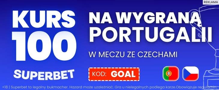 Przy okazji warto skorzystać z promocji u bukmachera Superbet. Podczas rejestracji podając nasz kod promocyjny GOAL, będziesz mógł skorzystać z promocji i postawić wygraną reprezentacji Portugalii z kursem 100.00. Więcej informacji o tej ofercie znajdziesz wyżej w tym artykule.