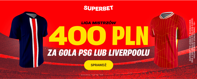 W środowym hicie Ligi Mistrzów nie powinno zabraknąć goli. Dlatego też warto zwrócić na specjalną ofertę Superbet, dzięki której można zgarnąć extra bonus 400 zł za wytypowanie drużyny, która zdobędzie choćby jednego gola w tym meczu. Bonus możesz zgarnąć stawiając kupon na gola bramkę PSG lub Liverpoolu już za 2 zł. Poniżej wyjaśniamy zasady oferty.