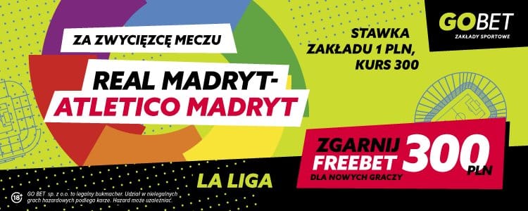 Inną ciekawą ofertę przygotował GOBET. W tym przypadku można postawić zakład na zwycięstwo Realu lub Atletico praktycznie po kursie 300 zł. Stawiając bowiem taki zakład za 1 zł możemy zgarnąć freebet 300 zł. Co trzeba zrobić?
