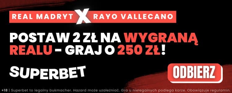 Superbet przygotował specjalną ofertę na niedzielne spotkanie. Oferuje bowiem dodatkowy bonus 250 zł za wytypowanie zwycięstwa Realu Madryt w meczu z Rayo Vallecano. Wystarczy spełnić warunki oferty i zagrać taki zakład za zaledwie 2 zł. Poniżej wyjaśniamy krok po kroku jak skorzystać z promocji.