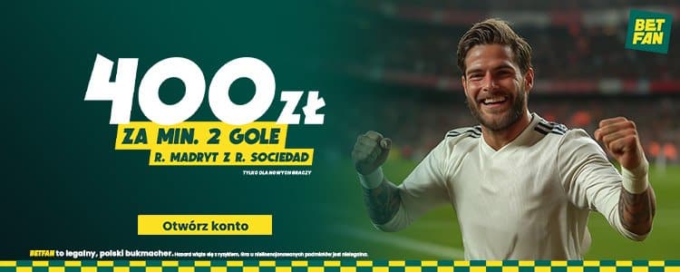 - Jeżeli Real Madryt zdobędzie przynajmniej dwie bramki w starciu z Realem Sociedad, to otrzymasz od BETFAN dwa freebety po 200 zł.