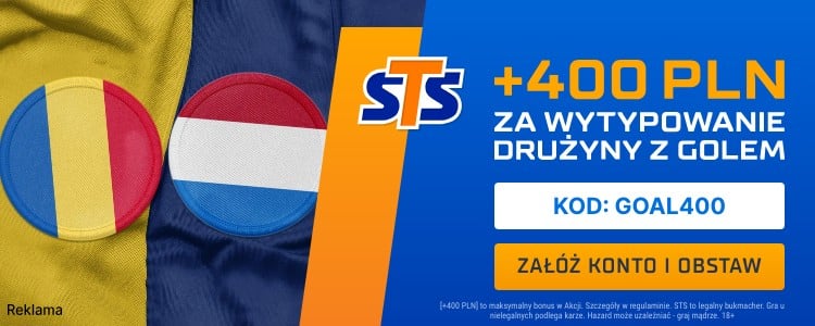 Warto również zwrócić uwagę na promocję STS – bonus 400 zł za wytypowanie gola dla Rumunii lub Holandii. Oferta obowiązuje przy rejestracji konta w STS z kodem promocyjnym GOAL400. Więcej informacji o tej ofercie znajdziesz wyżej.