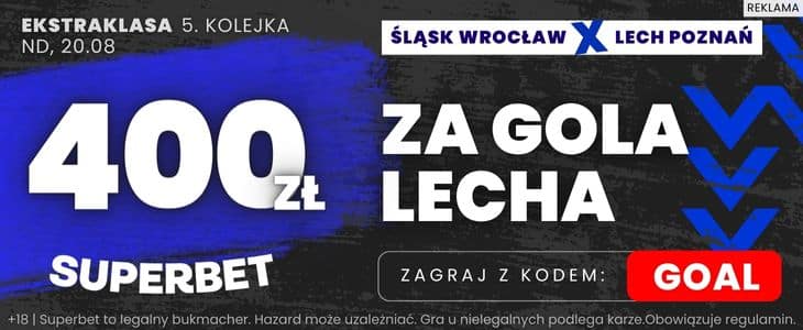 Za faworyta tego meczu uznawani są goście. Kurs na zwycięstwo Śląska waha się między 4.05 a 4.15. W przypadku ewentualnej wygranej Lecha jest to od 1.85 do 1.90. Przy okazji tej rywalizacji zachęcamy do skorzystania z oferty bukmachera Superbet. Wykorzystaj kod promocyjny Superbet GOAL i odbierz bonusy o łącznej wartości nawet 3754 zł.