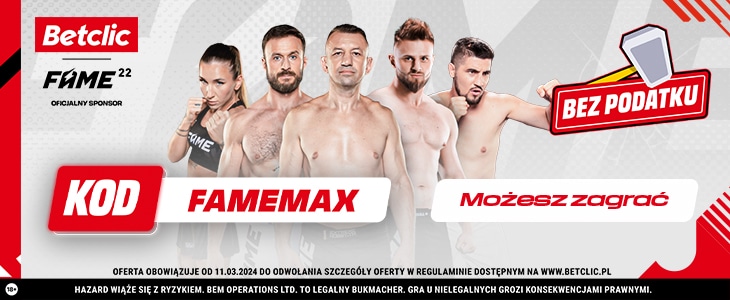 Na wstępie trzeba zaznaczyć, że walkę Tomasza Adamka z Don Kasjo będzie można obstawiać tylko w Betclic. Rejestrując się u bukmachera Betclic z naszym kodem FAMEMAX, będziesz mógł liczyć na zakład bez ryzyka (cashback) do 50 zł. Bonus powitalny bez problemu możesz wykorzystać na galę Fame MMA 22.