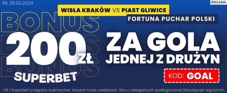Wisła do zdecydowanej większości ligowych spotkań przystępuje w roli faworyta. W przypadku środowego meczu w Pucharze Polski jest jednak inaczej. Mówią o tym również kursy bukmacherów na ten mecz. Według nich faworytem są goście. Rozważając typ na wygraną Piasta w podstawowym czasie gry kurs oscyluje w okolic 2.40. Z kolei typ na wygraną Wisły to kurs w granicach 2.70-3.10. W tym miejscu warto także zwrócić uwagę na ofertę Superbet dla nowych klientów. Podając podczas rejestracji Superbet kod promocyjny GOAL możesz postawić na gola jednej z drużyn po kursie 100.00. Więcej informacji o tej oferty znajdziesz powyżej.