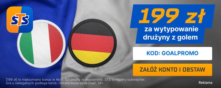 Czwartkowy mecz nie ma wyraźnego faworyta, gdyż bukmacherzy obu zespołom dają podobne szanse na triumf. Kurs na wygraną Włoch wynosi około 2.70, zaś typ na zwycięstwo Niemiec to mniej więcej 2.75. Natomiast współczynnik na remis w tej potyczce jest szacowany w granicach 3.30. Rejestrując konto w STS podaj kod promocyjny GOAL, a będziesz mógł odebrać zakład bez ryzyka do 100 zł oraz bonus od wpłat do 600 zł.